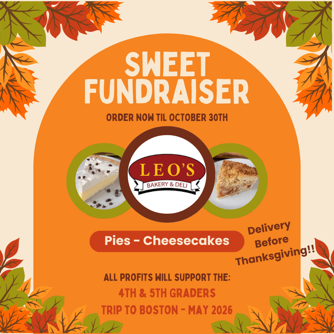 Our current 4th & 5th graders are selling Leo's Pies & Cheesecake to support their trip to Boston in May of 2026. If you are interested in ordering a delicious Pie or Cheesecake in time for Thanksgiving you can do so through any 4th or 5th grade student or by submitting an order through our GoogleForm. Orders and payments will be collected through Wednesday, October 30th. Delivery will be on November 20th - more details to follow.